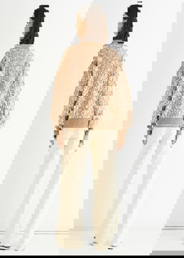 Stay cozy and stylish with this Camel Animal Print Wool Mix Cardigan Look Jumper. Crafted from a warm wool blend, it offers comfort and durability, while the bold animal print adds a trendy edge to your casual wardrobe. Perfect for layering on cooler days, this jumper combines softness with standout style effortlessly.