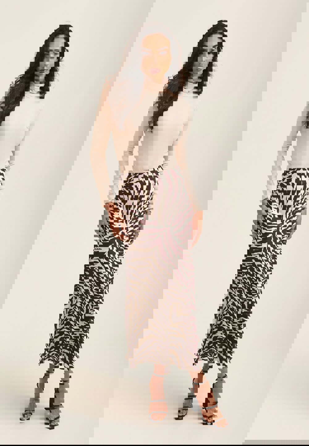 This Chocolate Animal Print Satin Bias Cut Midi Skirt will add a hint of trend-led glamour to any wardrobe. With its modern midi length and bias cut, you'll be sure to stand out in any occasion!