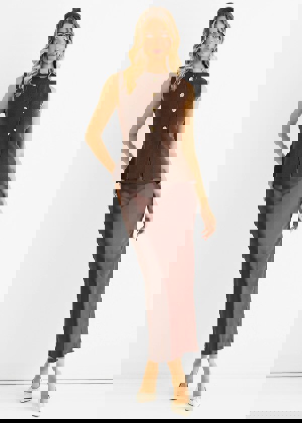 The Chocolate Button Front Compact Knit Waistcoat combines casual comfort with a bold touch. Made from soft, compact knit fabric, it features a button-front design and a flattering waistline that adds shape without sacrificing ease. Perfect for layering, this waistcoat brings warmth and style to any relaxed outfit.