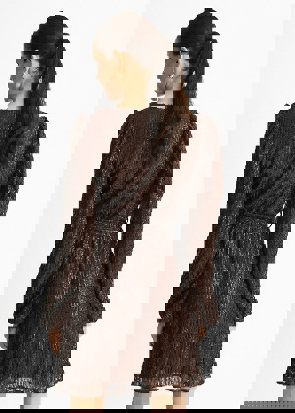 This Chocolate Sequin V Neck Belted Mini Dress combines bold sparkle with casual comfort. Its flattering V-neck and adjustable belt create a confident silhouette, while the mini length adds a playful touch.