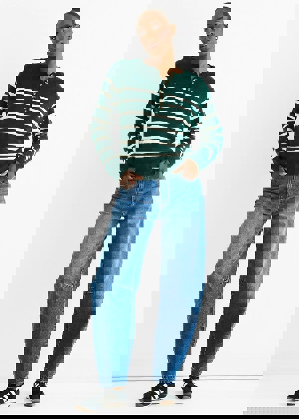 Embrace casual comfort with this Green Recycle Stripe Button Up Loose Fit Knit Jumper. Its loose fit ensures all-day ease, while the vibrant green stripes make a bold statement. The button-up front adds versatility, allowing you to style it open or closed. Ideal for relaxed weekends or layering on cooler days, this jumper blends sustainable materials with effortless style.