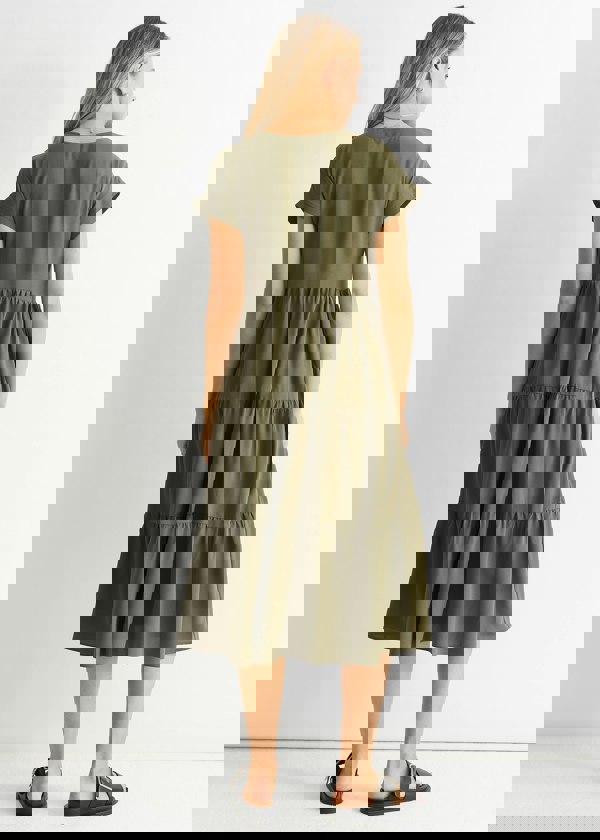 Indulge in luxurious elegance with our Khaki V Neck Pocket Smock Midi Dress. Its soft and flowing fabric drapes beautifully, while the v-neck and pockets add a touch of sophistication. Perfect for any occasion, this dress exudes exclusivity and class.