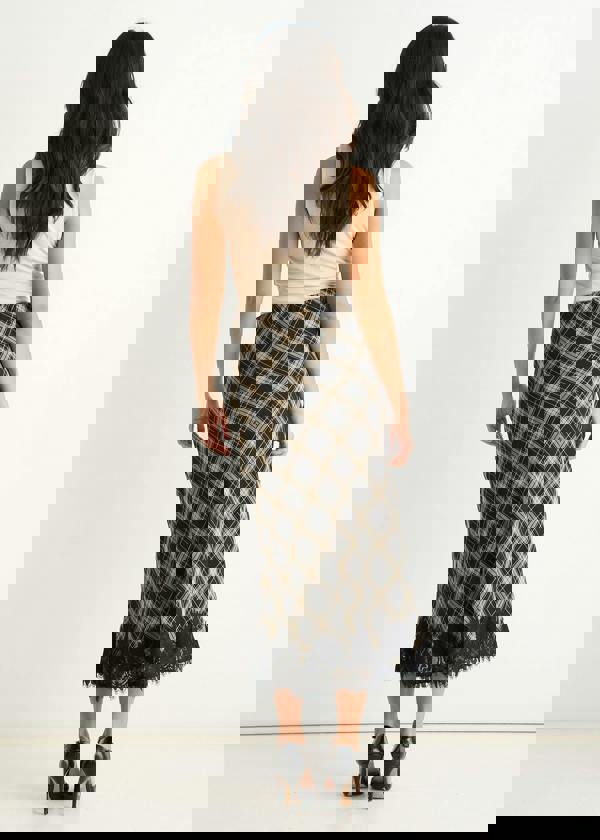 Elevate your everyday style with this striking Mono Check Skirt, where bold geometric patterns meet delicate contrast lace detailing. The bias cut creates a flattering, fluid silhouette that moves with you, while the lace accents add an unexpected touch of sophistication. Perfect for mixing prints or layering over basics, this piece bridges casual and dressy with effortless confidence.