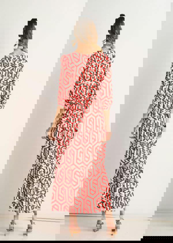 - Red and white maxi smock dress featuring a geometric print, 2/3-length sleeves and tiered layers for a relaxed, flowing silhouette.