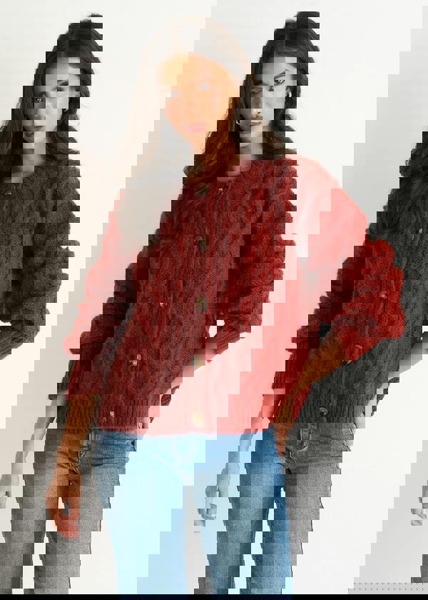 - Relaxed fit rust cable knit cardigan with classic button design for effortlessly, stylish layering