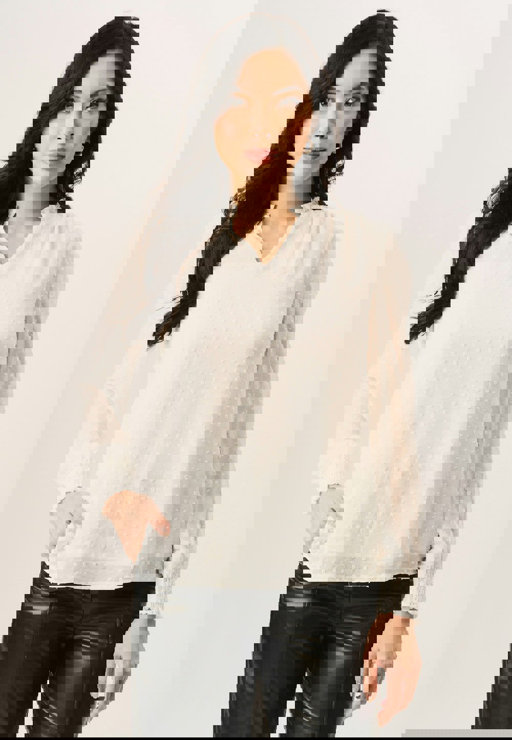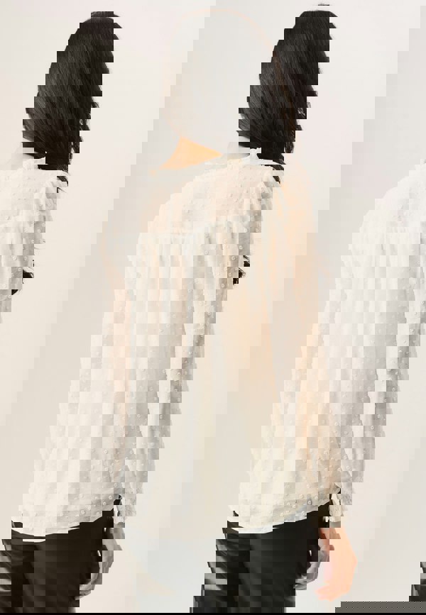 Elevate your fashion game with our White Dobby Chiffon Frill Neck Blouse. Made from lightweight chiffon fabric with delicate dobby detailing, this blouse features a frill neck for added style. Perfect for any occasion, it offers a blend of comfort and elegance.