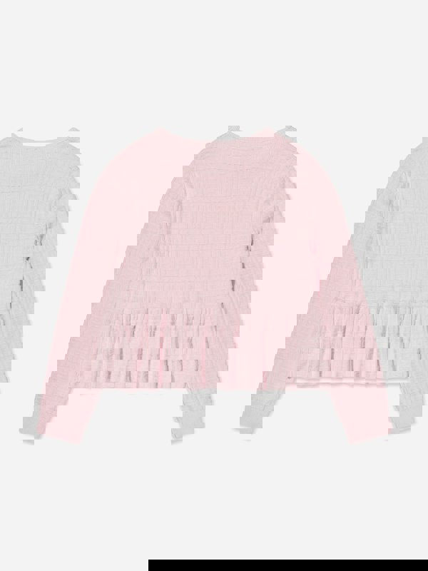 This girls’ knitted sweater from Givenchy comes in pink with a bold 4G jacquard pattern. The knit construction combines viscose, polyamide and elastane for a smooth, flexible finish. Long sleeves and a crew neck keep the silhouette clean and classic, while the peplum hem adds shape at the waist.