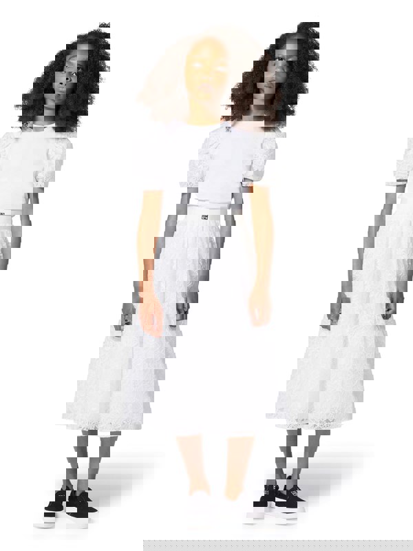 This girls skirt from Givenchy comes in white with 4G embroidery set over delicate mesh. A cotton percale lining adds structure, while the adjustable waist allows a secure fit. A 4G metal plate sits on the front belt for a branded finish, and a back zip closure completes the design.