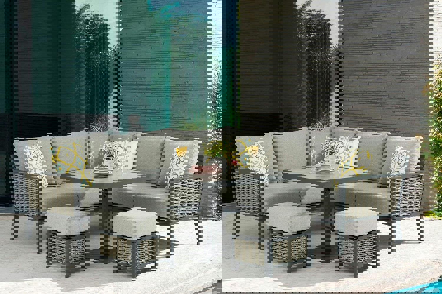 Designed to anchor a relaxed outdoor seating area, the Glendale Abbey 6-Seater Corner Sofa Set brings a considered balance of comfort and practicality to patios, conservatories and gardens. This corner sofa set includes a dual-height table, making it easy to switch between laid-back lounging and more structured dining as the occasion changes.