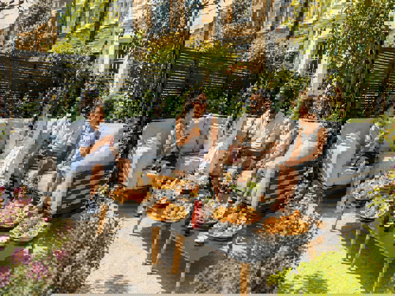 An aluminium frame construction keeps the set lightweight, while wooden-effect legs add a warm, painted finish. Two matching side tables are included, offering a practical spot for drinks, books or serving pieces when you are entertaining.
