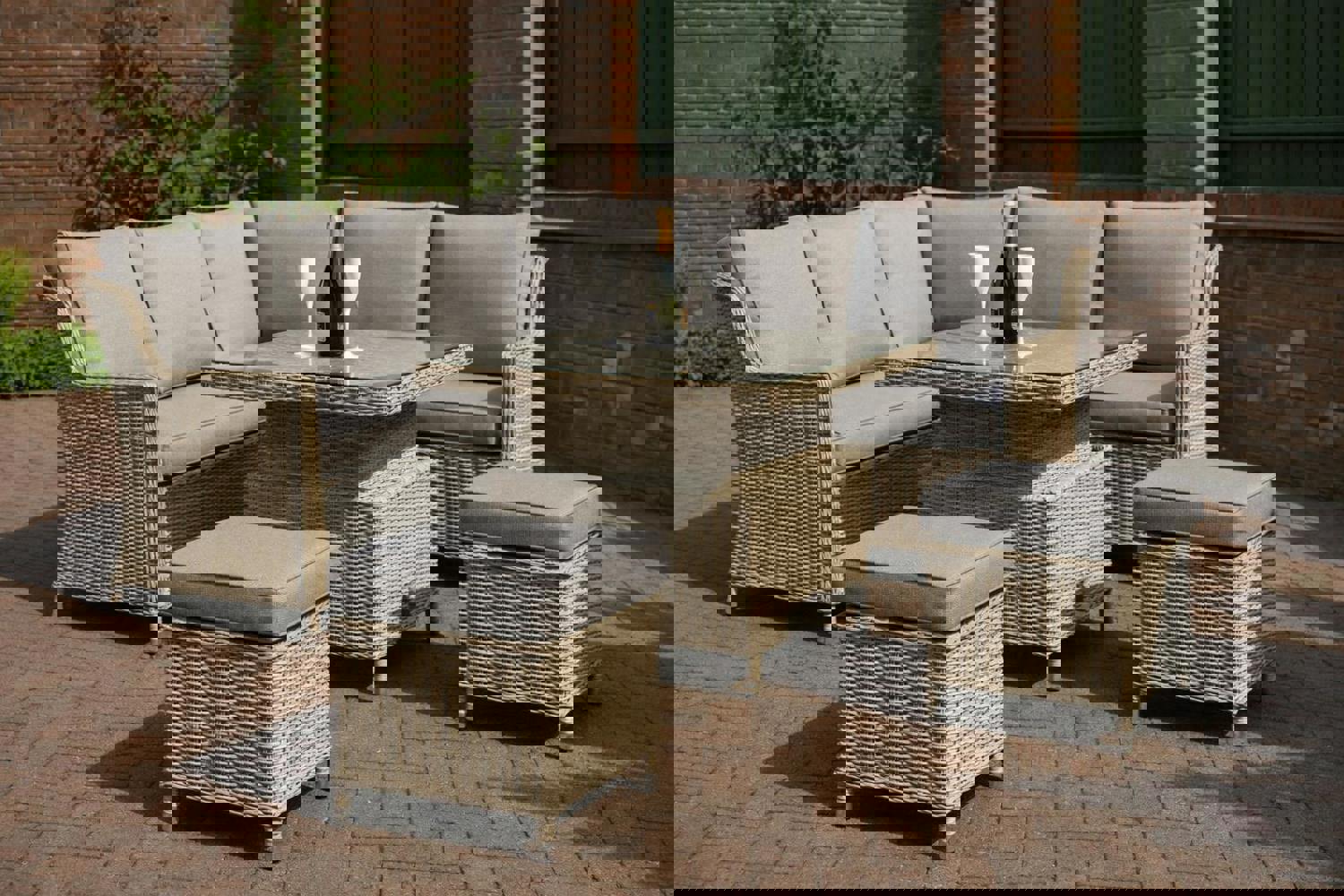 Crafted from weatherproof rattan, this corner set is made to handle life outside, with a space-conscious layout that helps maximise seating. Generously padded cushions are included, upholstered in durable outdoor fabric with removable, machine-washable covers for straightforward upkeep.