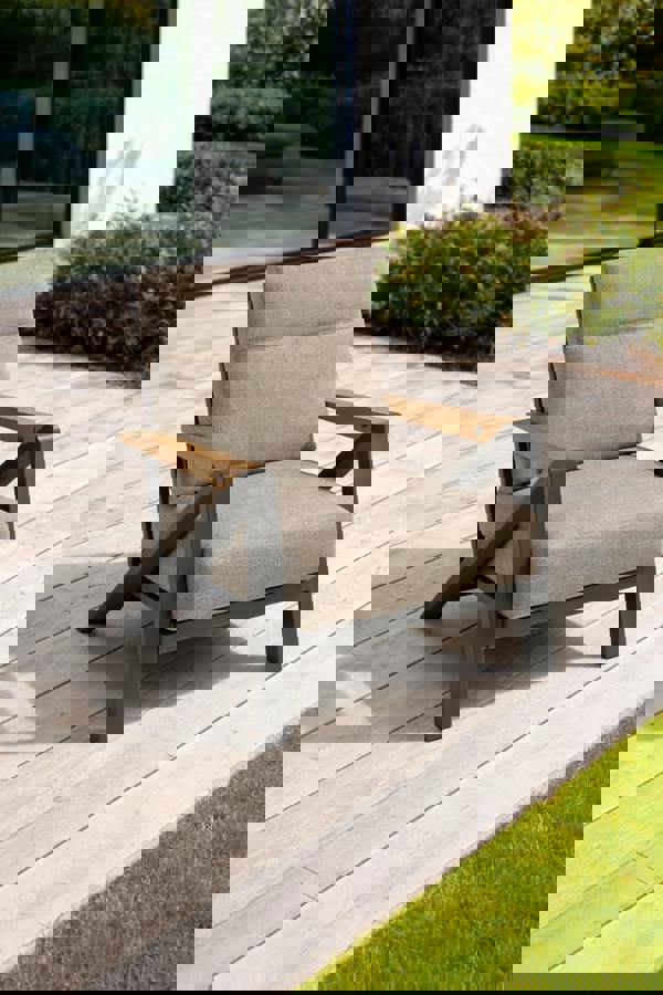 Crafted from aluminium with teak accents, this set balances a modern profile with natural warmth. The aluminium frame is designed for stability and resistance to rust, while the teak top adds character and is described as highly resistant to a range of weather conditions. For comfort, each seat includes thick, plush cushions that encourage you to linger a little longer at the table.