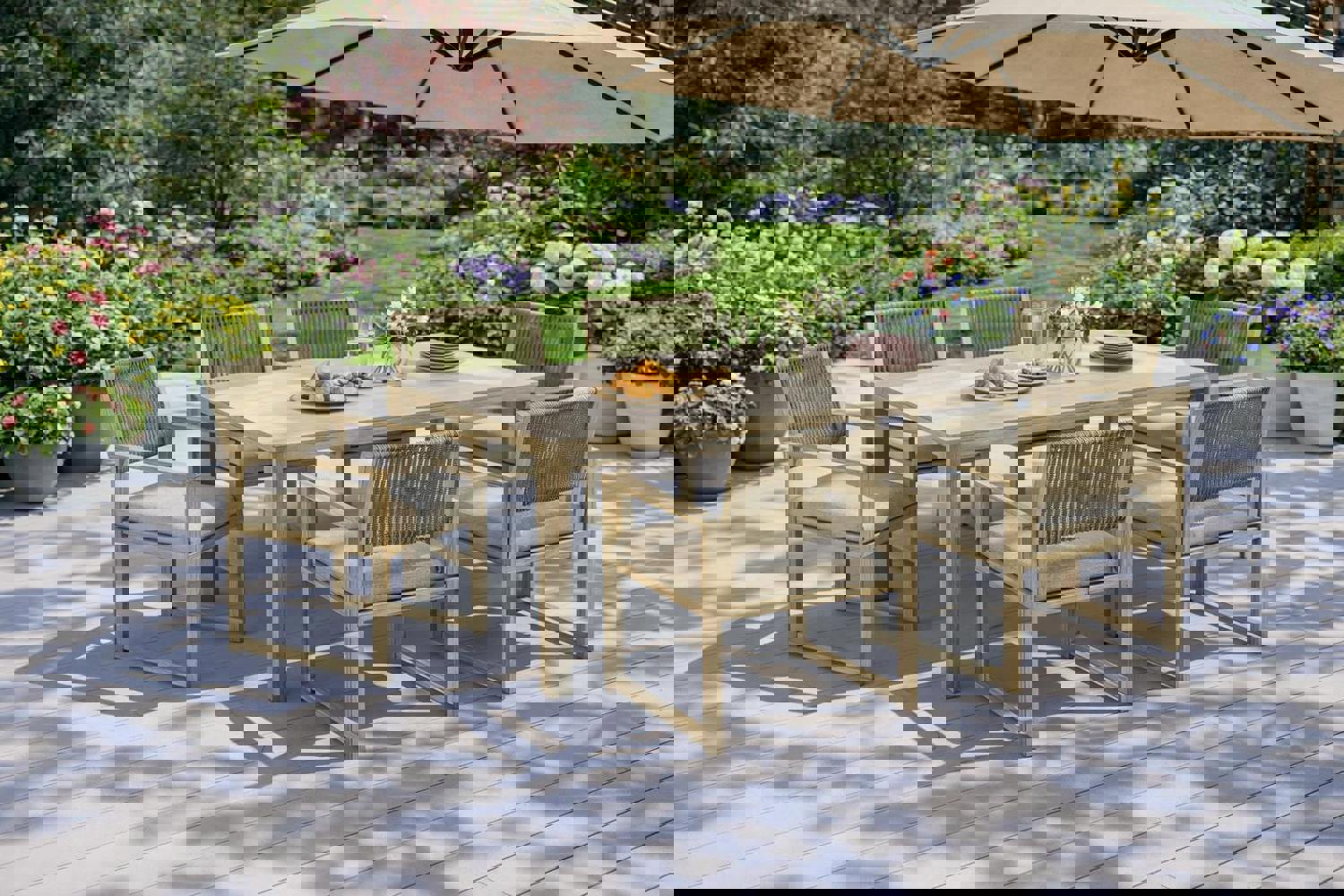 Designed for comfort as well as style, the set includes soft-touch, season-proof cushions that help you settle in, whether you are starting the day with breakfast outside or hosting family for an evening meal. With generous proportions across the table and chairs, it offers a practical layout for sociable dining while keeping the overall look clean and timeless.