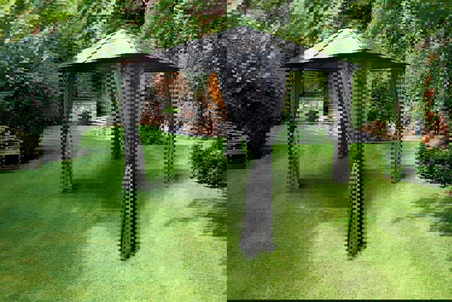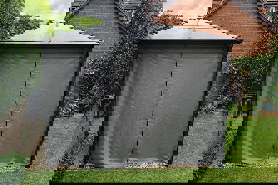 Designed for a more permanent presence outdoors, the Glendale Peninsula Garden Gazebo pairs a matt black powder-coated steel frame with a bronze tinted polycarbonate roof for a clean, architectural finish. Unlike fabric canopies, the polycarbonate roof is intended to stay in place, offering a practical option for gardens where you want reliable cover season after season.