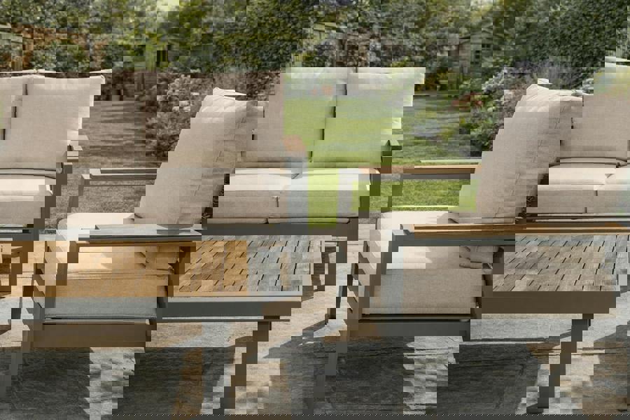 Elegantly curved backs create a refined silhouette, while the included deep-filled cushions add a more indulgent finish for longer lounging. A teak wood style coffee table completes the arrangement, providing a practical surface for drinks and snacks when you have guests over.