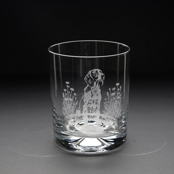 This English Setter Whiskey Tumbler Glass is hand-etched with a stunning design of a English Setter, making it the perfect gift for English Setter lovers.