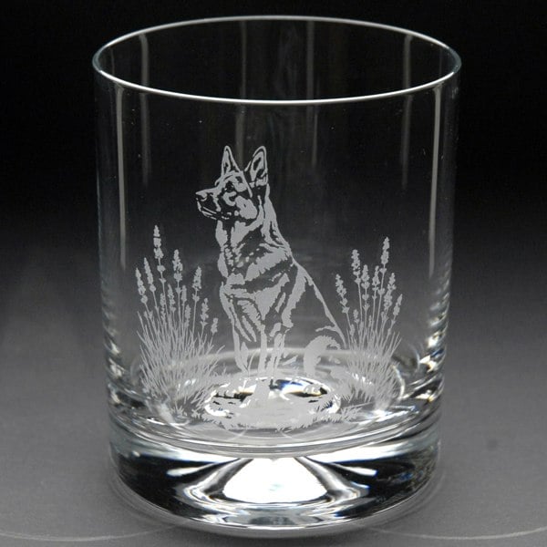 This German Shepherd Whiskey Tumbler Glass is hand-etched with a stunning design of a German Shepherd, making it the perfect gift for German Shepherd lovers.