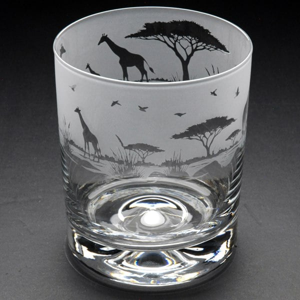 This Giraffe Whiskey Tumbler Glass is hand-etched with a stunning design of a Giraffe, making it the perfect gift for Giraffe lovers.