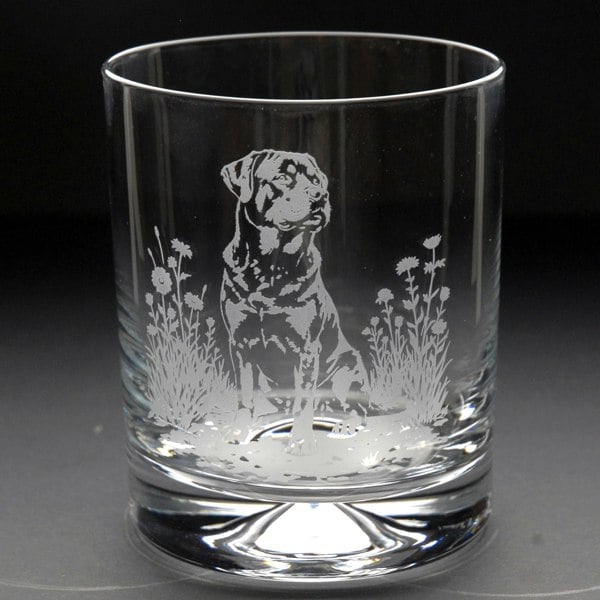 This Rottweiler Whiskey Tumbler Glass is hand-etched with a stunning design of a Rottweiler, making it the perfect gift for Rottweiler lovers.