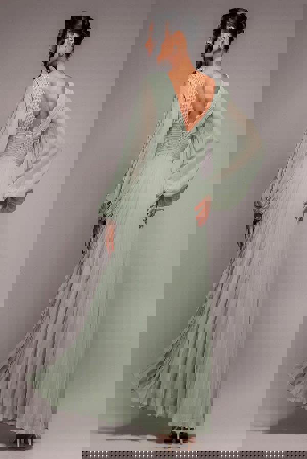 The pleated waistband and delicate pleating detailing enhance the silhouette, while the soft sage green adds an effortlessly fresh, spring-summer vibe.