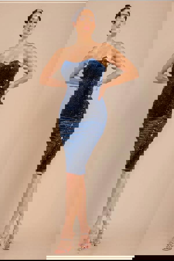 This versatile midi dress is perfect for the party season! The shiny navy sequin and velvet fabric is so elegant and stylish, it's the ultimate party dress to turn heads anywhere you go.