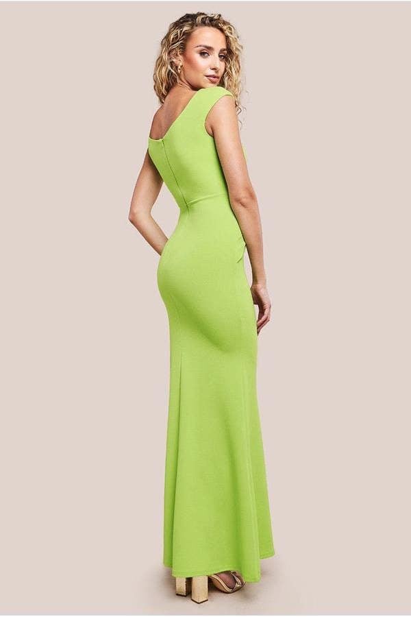 Whether you're attending a wedding, dancing the night away at a prom, or enjoying a luxurious cruise, this lime Bardot Pleated Maxi will ensure you stand out with timeless elegance and style.
