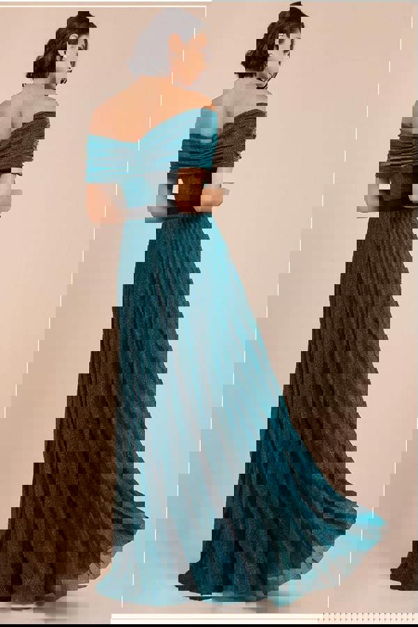 Off the shoulder style, fitted waist, flowy skirt, shimmery finish - this maxi dress has it all! This long evening dress has a classic and chic look that will always be in style, perfect as a prom dress in the summer or for bridesmaids for a wedding in any season.