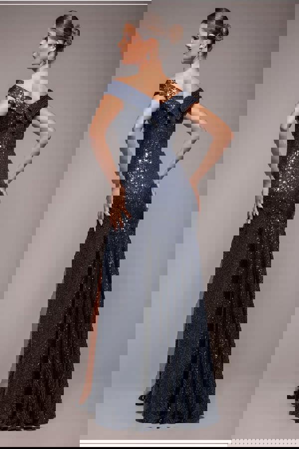 The beautiful sequin finish creates an elegant and glamorous look as they shine on the dress with each movement, while the off-the-shoulder neckline, front thigh slit and pleated hem add just enough drama to make this a unique choice for your party or event.