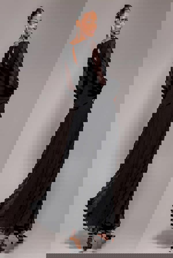 Long bishop sleeves with delicate chiffon detailing add a romantic and feminine touch, flowing seamlessly into a soft chiffon A-line skirt for an effortlessly alluring silhouette.