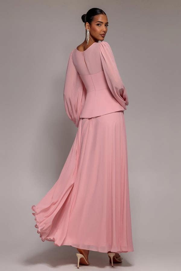 Command attention in blush pink with the Goddiva Bishop Sleeve Peplum Top Scuba Crepe And Chiffon Maxi Dress.