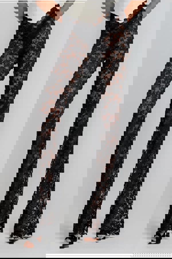 The Bootcut Scalloped Lace Trouser in classic noir brings a modern twist to timeless femininity, blending luxe lace detail with a trending bootcut silhouette.