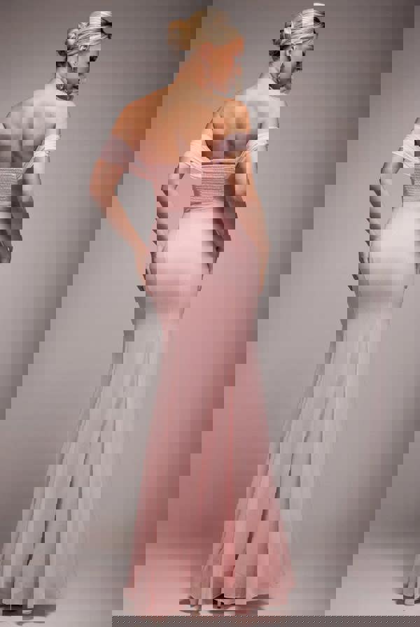in its delicate chiffon material, this long pastel pink gown is an all-round winner this occasion season