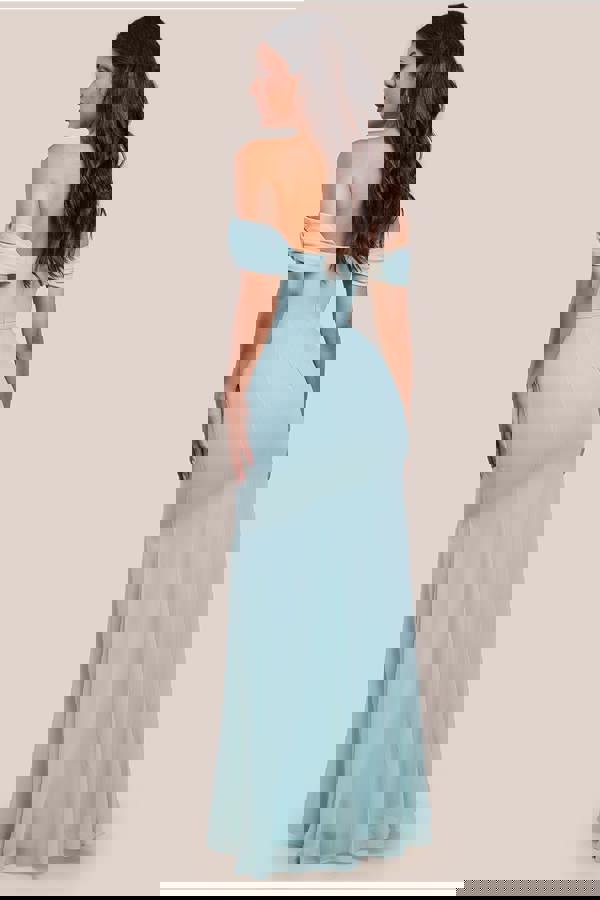 With its off the shoulder style and unusual cowl neck, this elegant evening dress will have you looking and feeling like the belle of the ball.