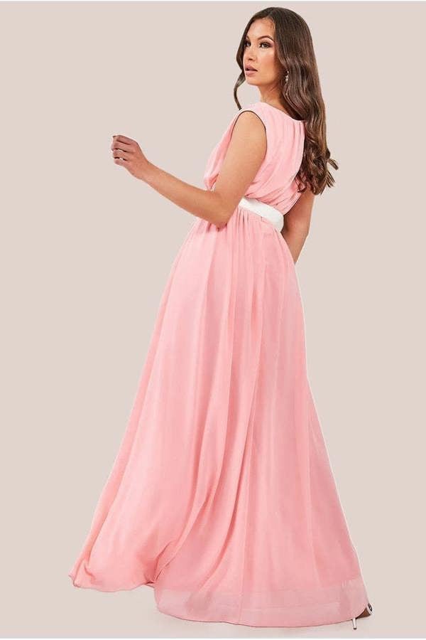 With its free flowing maxi length teamed with its classy round neckline and sleeveless style matched with its delicate chiffon bed and sparkling embellished belt, this peach dress is the perfect choice for bridesmaids and prom queens.