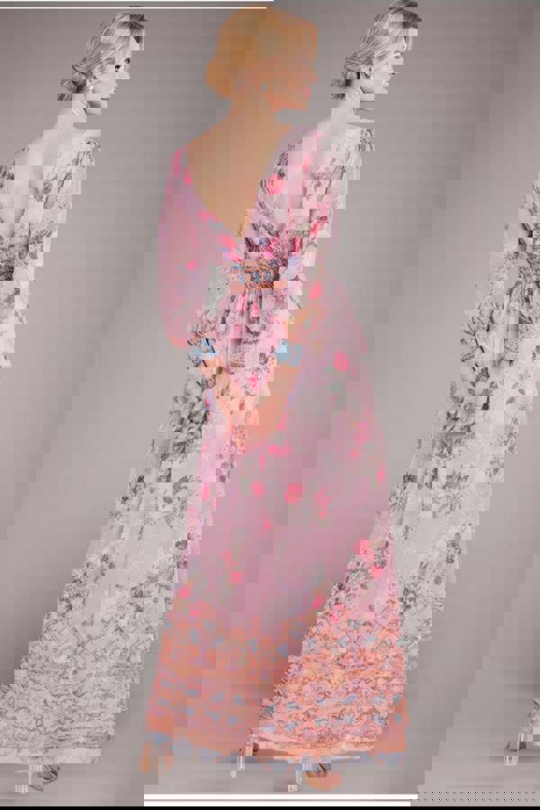 This vibrant floral design captures the essence of summer, featuring a flattering silhouette with a chic V-neckline and graceful three-quarter balloon sleeves finished with elasticated cuffs for a touch of whimsy.