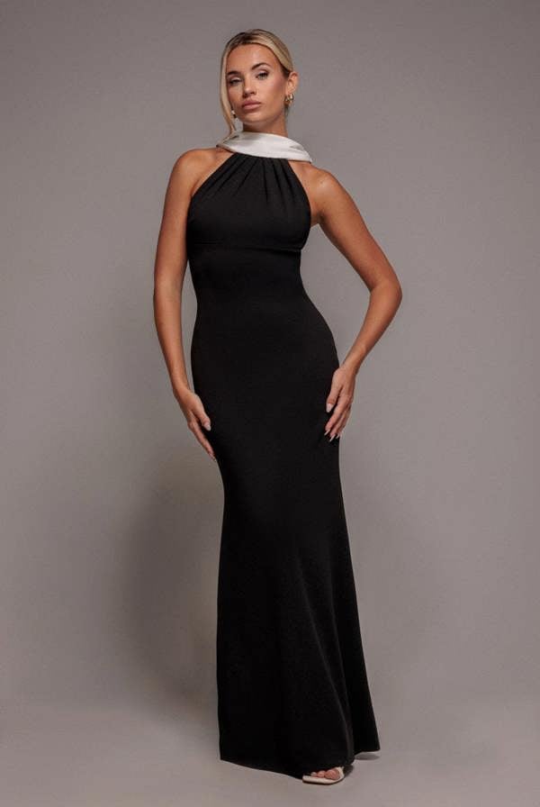 Goddiva Contrast Crepe Halterneck Maxi Dress with Sash in Black Cream delivers high glamour with a body skimming fit and dramatic mermaid hem.