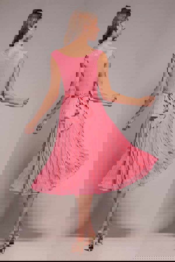 The Goddiva Cowl Neck Pleated A-Line Chiffon Midi Dress in Coral is the perfect blend of romantic charm and contemporary elegance.