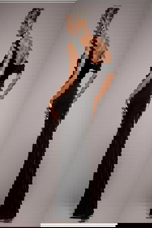 Unveil a touch of glamour with our Black Cowl One Shoulder Velvet Maxi Dress.