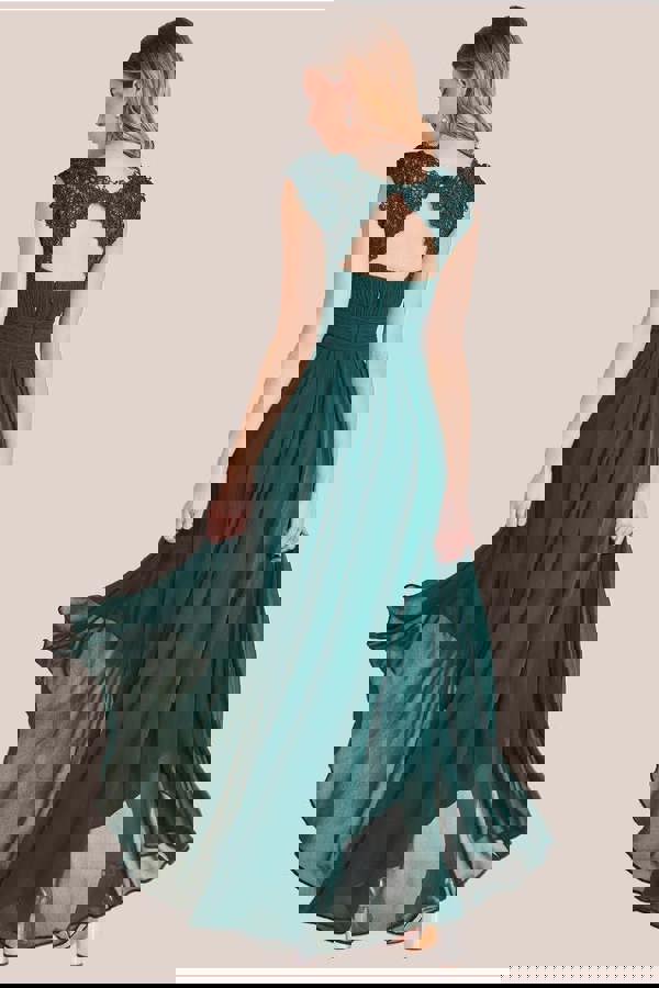A harmonious fusion of elegance and charm the goddiva crochet & pleated top high low maxi is crafted with meticulous attention to detail, this green dress showcases a timeless round neckline that frames your neckline with grace.