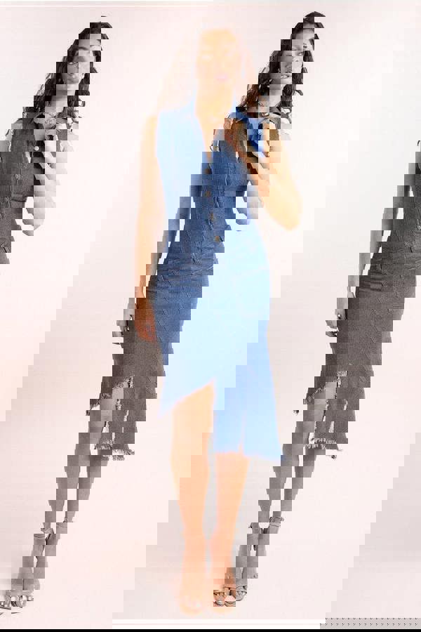 Dive into effortless chic with our Denim Frayed Asymmetric Sleeveless Shirt Dress.