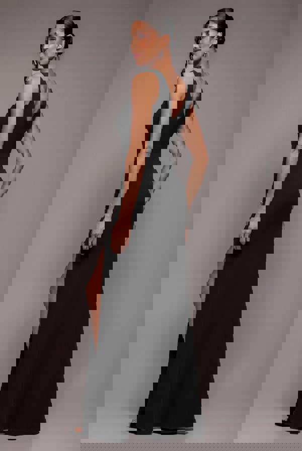 Turn heads in the stunning Goddiva Diamante Brooch Thigh Split Mermaid Maxi Dress in black. This glamorous piece features a daring front thigh split, adorned with sparkling diamante-embellished bows that catch the light with every step. The sleeveless design and v-neckline create a sleek and modern silhouette, while the bodycon fit flatters your figure beautifully. The mermaid hem adds a dramatic touch, flaring out elegantly to create a striking effect. In classic black, this dress is a showstopper, offering a perfect balance of sophistication and allure, making it an unforgettable choice for any special occasion.