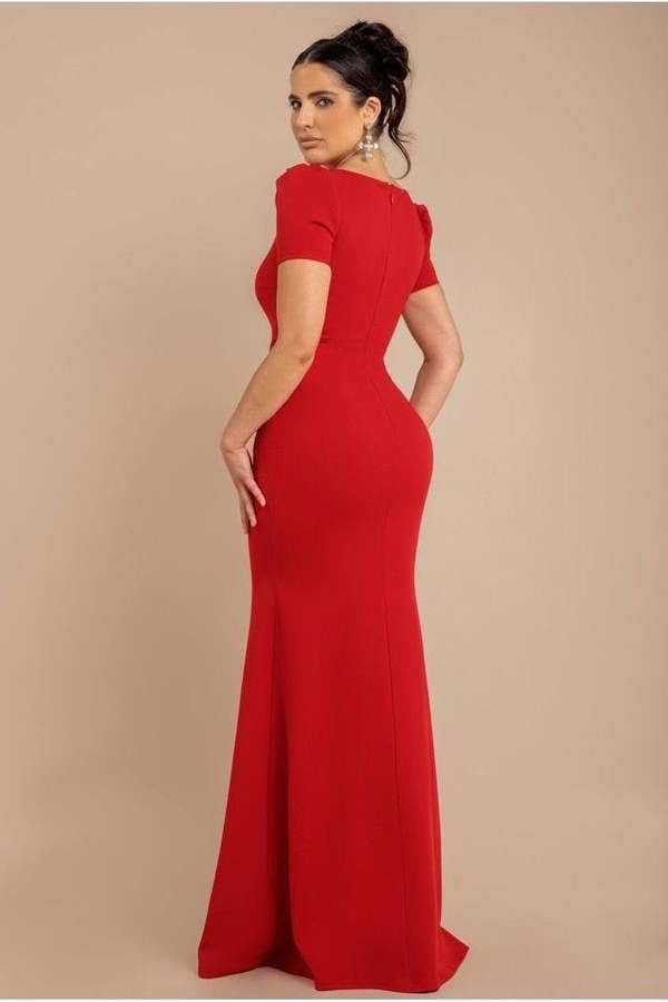 Turn heads in the striking Goddiva Diamante Embellished Heart Brooch Scuba Maxi Dress in red. This sensational dress features a bodycon fit that accentuates your silhouette beautifully, while the bold red colour adds a vibrant, eye-catching allure. The short sleeves offer a modern touch, and the dramatic cut-out down the bust is adorned with sparkling diamante heart brooches that catch the light with every movement. The fishtail hem enhances the dress’s elegant flow, completing a look that is both captivating and unforgettable. In rich red, this maxi dress combines glamour and sophistication, ensuring you stand out in style at any occasion.