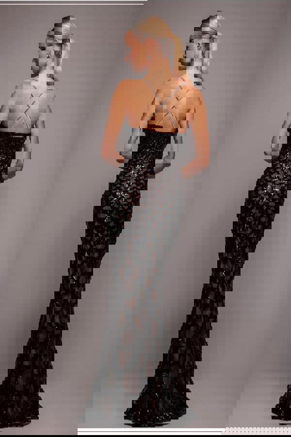 At the back, criss-cross diamante straps add a touch of luxury, making this black sequin gown a true showstopper.