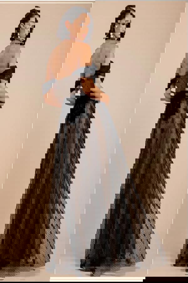 Elevate your evening ensemble with the timeless charm of our Dobby Mesh Off-the-Shoulder Princess Maxi Dress.