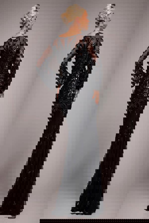 Featuring a sultry V neckline and flowing bishop style long sleeves, this limited edition dress sparkles with exquisite sequin detailing for a luxe, high-end look at an affordable price.