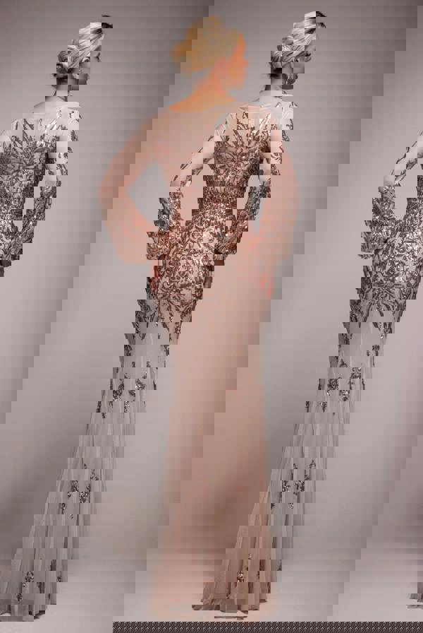 Featuring a sultry V neckline and long bishop sleeves, this luxurious dress shimmers with intricate sequins that catch every light.