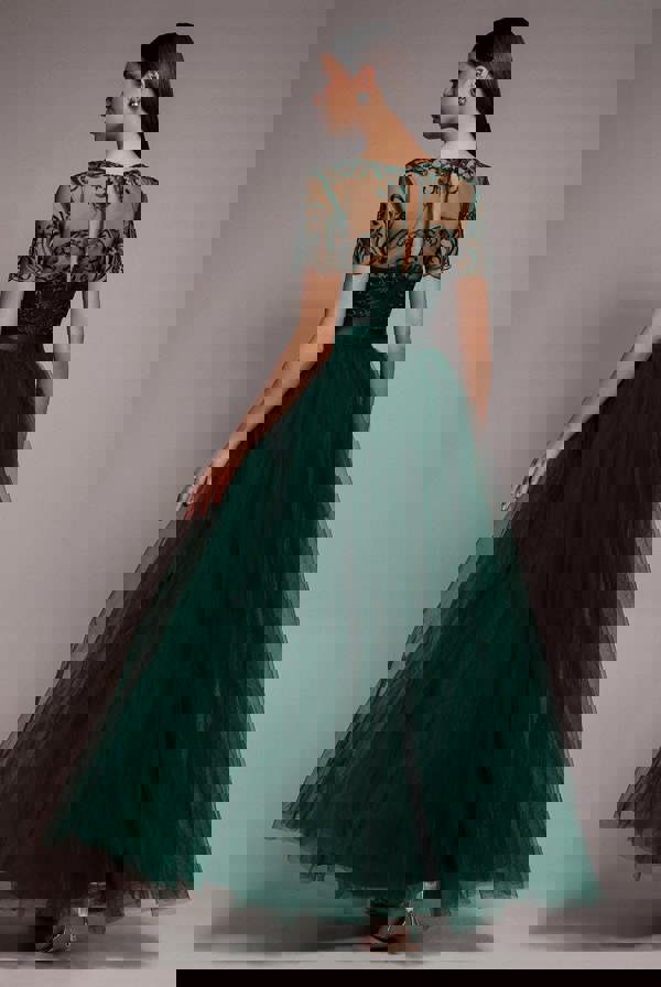 Envelop yourself in an aura of romance and princess-like allure with the accentuated cut and intricate embroidery pattern of this dress.