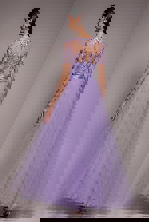 The embroidered mesh bodice and round neckline give it a luxurious feel, while the fully lined skirt makes this dress both elegant and comfortable to wear.