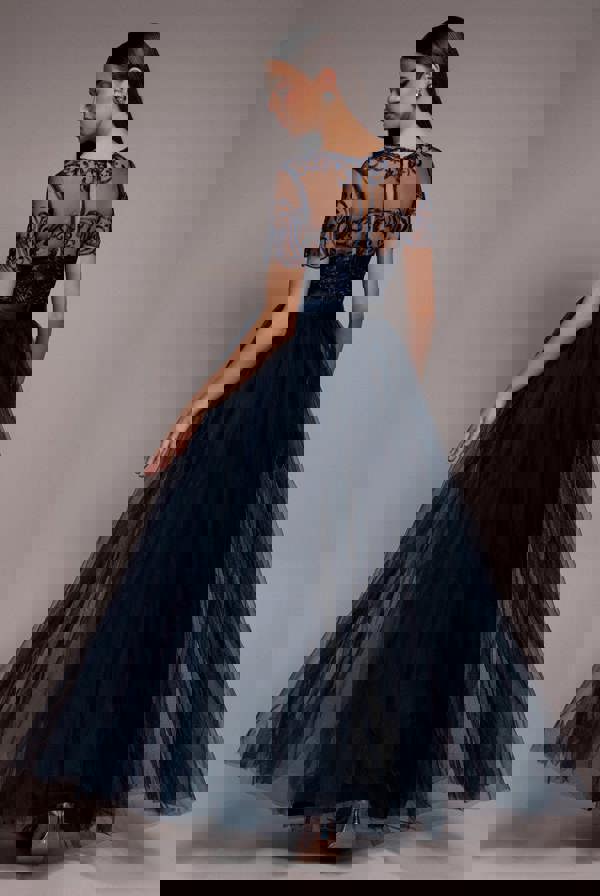 The embroidered mesh bodice and round neckline give it a luxurious feel, while the fully lined skirt makes this dress both elegant and comfortable to wear.