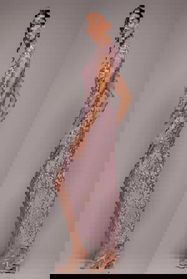 Goddess vibes meet chic sophistication with the Goddiva Embroidered Sequin Tassel Front Split Midaxi Dress in blush pink.